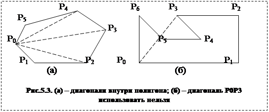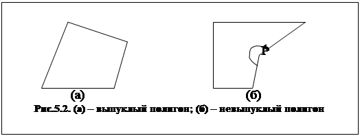 Если внутренние углы при всех вершинах полигона меньше 0°, то такой полигон называется выпуклым. На рис. 5.2(б) утренний угол при вершине Р больше 180°. Такую вершину будем называть невыпуклой. Все другие вершины на рис. 3.8 - выпуклые. Если полигон имеет хотя бы одну невыпуклую вершину, то весь такой полигон будем называть невыпуклым. Если А и В — две точки на границе выпуклого полигона, то и весь отрезок АВ будет принадлежать полигону. Для невыпуклых полигонов это условие может не соблюдаться. Невыпуклость полигонов является источником сложностей, это же касается и переменного числа вершин полигонов. По этой причине уделим большое внимание треугольникам. Вполне очевидно, что треугольники всегда имеют фиксированное число вершин и они обязательно выпуклые. Особый интерес к ним выявляется в связи с рассмотрением произвольных полигонов, поскольку любой полигон может быть разбит на конечное число треугольников. Это и будет предметом рассмотрения данного пункта.