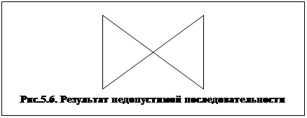 Это условие является необходимым, но, к сожалению, недостаточным, как это показано на рис.5.5. Здесь точки Р0, Р1, Р2 обходятся именно в таком порядке, в направлении против часовой стрелки, но отрезок Р0Р2 нельзя использовать для деления полигона на треугольники. Такой ситуации можно избежать, ели принимать во внимание также длину диагоналей. Будем выбирать наикратчайшую диагональ Рi-1Рi+2, которую может меть выпуклая вершина Рi между точками Рi-1 и Рi+1. Эта диагональ используется для отсечения треугольника Рi-1РiРi+1. Затем таким же образом проверяется оставшийся полигон Р0, Р1,..., Рi-1, Рi+1,..., Рn-1 и так далее. Технически это реализуется введением целочисленного массива v0,..., vm-1, содержащего номера вершин оставшеюся полигона. Вначале задаем m = n и vj = j (i = 0, 1,..., n - 1). Каждый раз при отсечении треугольника число m уменьшается на единицу. Если подобная программа предназначается для практического применения, то желательно выполнить некоторое число испытаний на допустимость входных данных. Программа, которая надежно отвергает любой непригодный набор данных, может быть названа устойчивой. В нашей ситуации необходимо провести испытание, действительно ли заданный набор координат точек n x0 y0 x1 y1... xn-1 yn-1 вообще описывает полигон. Например, совершенно непригодна последовательность 4 1 1 2 2 2 1 1 2 поскольку обход точек в заданном порядке приведет к ситуации, оказанной на рис. 5.6, но в качестве полигона такую фигуру принять нельзя.