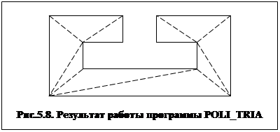 void main() { int i, h, j, m, k, imin; double diag, min_diag; printf("%s %s ", “Задайте число вершин n и затем n пар координат вершин (x, у) ", " в порядке обхода против часовой стрелки "); scanf("%d", &n); if (n>=NMAX) { printf (“Число n слишком велико "); exit(1); } for (i=0; i<n; i++) {scanf("%f %f", &x[i], &y[i]); v[i]=i; } initgr(); m=n; draw_polygon(); while (m>3) { min_diag = BIG; for (i=0; i<m; i++) { h = (i==0?m-1:i-1); j=(i==m-1?0:i+1); if (counter_clock(h, i, j, &diag)&&(diag<min_diag)) { min_diag=diag; imin=i; } } i=imin; h=(i==0?m-1:i-1); j=(i==m-1?0:i+1); if (min_diag==BIG) error_gr("Неправильное направление обхода "); dash(x[v[h]], y[v[h]], x[v[j]], y[v[j]]); m--; for (k=i; k<m; k++) v[k]=v[k+1]; } endgr(); }