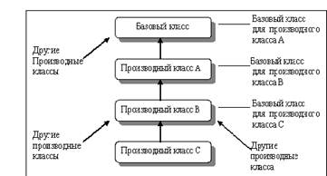 Рис. 3.3. Производный класс может Быть базовым классом других производных классов Производный класс наследует из базового данные-члены и функции-члены, но не конструкторы и деструкторы. Пример: на рис. 3.3 производный класс А наследует свойства базового класса в вершине иерархии. Производный класс В наследует кроме этого и новые свойства класса А. Производный класс С наследует свойства верхнего базового класса и производных классов А и В.