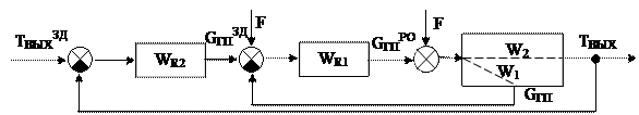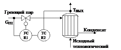 Основной канал – регулирование температуры на выходе аппарата расходом греющего пара: GГП ® ТВЫХ. Вспомогательный канал - стабилизация расхода греющего пара: GГП ® GГПРО. Регуляторы включены последовательно. Вспомогательный регулятор R1 стабилизирует расход пара, а основной регулятор R2 корректирует задание регулятору R1 по изменению основного регулируемого параметра. Методика настройки каскадной АСР. Настройки регуляторов R1 и R2 взаимосвязаны и их расчет осуществляется итерационным методом. На каждом шаге итерации рассчитывается приведенная АСР, в которой один из регуляторов условно отнесен к объекту.