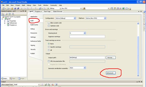 Здесь произведение значений а и b превышает диапазон представления значений типа byte. Следовательно, результат данного выражения не может быть записан в переменную result, тип которой byte. Для управления подобными исключениями в С# используются операторы checked и unchecked. Чтобы указать, что некоторое выражение должно быть проконтролировано на предмет переполнения, используйте ключевое слово checked. А чтобы проигнорировать переполнение, используйте ключевое слово unchecked. В последнем случае результат будет усечен так, чтобы его тип соответствовал типу-результату выражения. Замечание. По умолчанию проверка переполнения отключена (галочка не стоит). В результате код выполняется быстро, но тогда программист должен быть уверен, что переполнения не случится или предусмотреть его возникновение. Как мы уже упоминали, можно включить проверку переполнения для всего проекта, однако она не всегда нужна. С помощью использования операторов checked и unchecked в С# реализуется механизм гибкого управления проверкой Можно задать (или отключить) проверку переполнения сразу для всего проекта. Для этого необходимо выполнить следующие действия