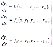 Аналогічно, як і для нормального диференціального рівняння можна сформулювати теорему існування і єдиності розв’язку для нормальної системи (8.8). Теорема Пікара. Якщо праві частини системи (8.8) неперервні в деякій області початкової точки Умови теореми Пікара виконуються, якщо праві частини нормальної системи поліноми відносно Теорема Пікара для лінійної системи (8.12) має такі ж дві особливості, що і в випадку лінійного рівняння першого порядку: 1) початкові значення шуканих функцій можна задавати довільно, а початкове значення незалежної змінної можна брати будь-яким з інтервалу 2) розв’язок задачі Коші визначений і неперервно диференційовний на всьому інтервалі Якщо всі Задачу Коші для нормальної системи (8.8) не завжди вдається розв’язати в точному вигляді, тому виникає необхідність побудови наближених методів знаходження розв’язків задачі Коші. Розглянемо нормальну систему (8.8)