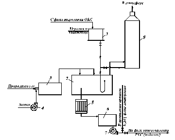 Концентрирование серной кислоты проводят следующим образом. Слабая серная кислота с первой стадии регенерации отработанной кислотной смеси подается в напорный бак 1, откуда поступает с заданным расходом в концентратор 2. Топочные газы образуются в топке 3 при сжигании природного газа (может использоваться мазут) в смеси с воздухом, подаваемым вентилятором 4. Они поступают в первую камеру концентратора 2 и, барботируя через кислоту, нагревают ее до температуры 230 – 250 °С. Кислота и топочные газы движутся в противотоке. В результате межфазного теплообмена газы насыщаются парами воды, а концентрация серной кислоты увеличивается. Кислота выходит из первой камеры с массовой долей 92 –93 % и температурой 230 – 240 °С, охлаждается в холодильнике 5 и поступает в сборник 6, откуда насосом 7 подается на стадию разгонки отработанной кислотной смеси. Избыток крепкой серной кислоты направляется на фазу приготовления рабочей кислотной смеси. Газы, выходящие из концентратора, содержат туман и пары серной кислоты, сернистый газ и небольшое количество оксидов азота. Они поступают в электрофильтр 8, представляющий собой большую футерованную кислотоупорным материалом камеру, в которой размещена система электродов. На электроды подается напряжение 80 кВ. Частицы тумана кислоты под действием электрического поля оседают на электроды, и кислота стекает в нижнюю часть электрофильтра, откуда снова поступает в концентратор. Недостаток электрофильтра в том, что он не улавливает сернистый газ и оксиды азота, попавшие в серную кислоту при разгонке отработанной кислотной смеси. Кроме того, это сложное и громоздкое сооружение, строительство которого требует значительных капитальных затрат. Для устранения указанных недостатков разработана установка концентрирования на основе колонного аппарата, в котором процесс выпаривания воды идет в вихревом потоке серной кислоты [9]. В колонне предусмотрены пять рабочих ступеней испарения, что значительно уменьшает туманообразование серной кислоты в процессе концентрирования и позволяет отказаться от электрофильтров.