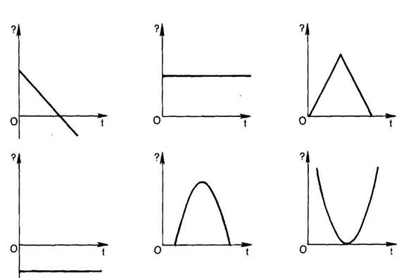 Упражнение 27 1. Тело падает с некоторой высоты над землей. В момент падения на землю скорость его равна 30 м/с. С какой высоты упало тело? 2. Снаряд, получивший при выстреле из орудия начальную скорость 280 м/с, летит вертикально вверх. На какой высоте его кинетическая энергия равна потенциальной? 3. Баба копра при падении с высоты 8 м обладает в момент удара о сваю кинетической энергией 18 000 Дж. Какова масса бабы копра? 4. Тело массой 2 кг падает с высоты 30 м над землей. Вычислите кинетическую энергию тела в момент, когда оно находится на высоте 15 м над землей и в момент падения на землю. 5. Растянутая пружина, сокращаясь, увлекает за собой тело массой 50 кг по горизонтальной плоскости без трения. В момент, когда деформация пружины равна нулю, скорость тела равна 5 м/с. На сколько была растянута пружина, если ее жесткость равна 10 000 Н/м? Задание Тело брошено вертикально вверх. На рисунке 144 показаны графики зависимости не обозначенных на оси У величин от времени. Какой из этих графиков показывает изменение со временем: а) координаты тела; б) ускорения; в) потенциальной энергии; г) импульса; д) кинетической энергии; е) полной энергии?