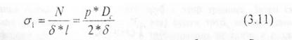 Тангенциальные напряжения о, можно найти, разрезав сепаратор диаметральной плоскостью и отбросив верхнюю часть (рис. 18, б). На диаметральную плоскость в оставленной части сепаратора действу давление р. Оно уравновешивается силами N, растягивающими материал сепаратора в направлении, перпендикулярном образующим. При условии равновесия можно записать p*Dc*l = 2*N отсюда