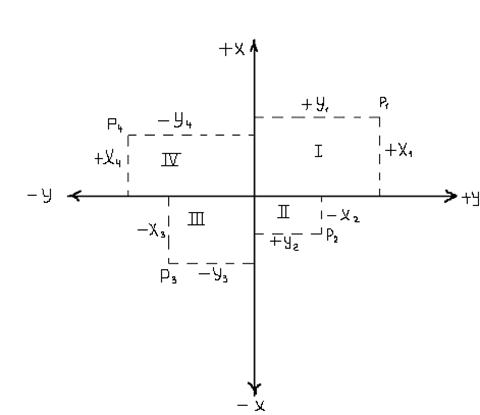 Положение любой точки на плоскости в данной системе определяется координатами Х, У. Их знак зависит от четверти, в которой находится точка. Проекции линии ОА на оси Ох или Оу называются приращениями координат …Х и …У с соответствующими знаками.