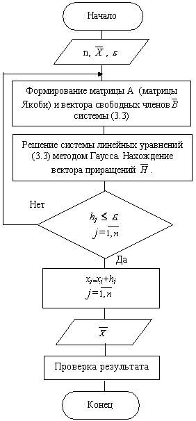 Рис. 10.5. Схема алгоритма метода Ньютона (аналитическое определение матрицы Якоби)