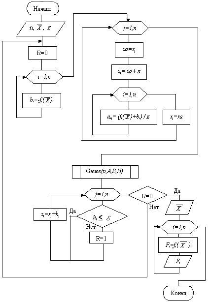 Рис. 10.6. Схема алгоритма метода Ньютона (определение матрицы Якоби с помощью численного дифференцирования)
