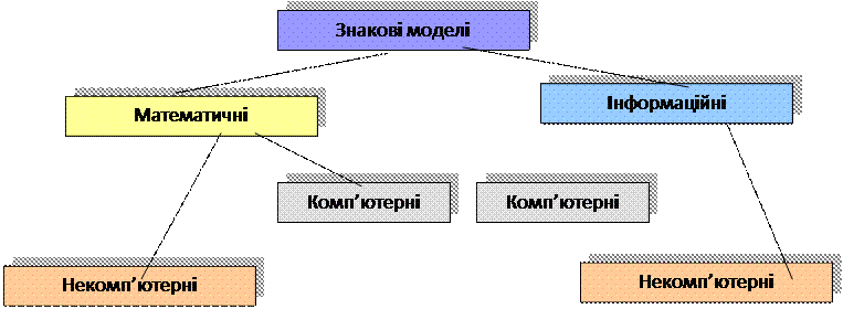 Під час вивчення інформатики нас цікавитимуть інформаційні моделі, тобто такі, що стосуються інформаційних процесів. До якої із вказаних вище множин можуть належати ці моделі? По-перше, інформаційні моделі мають бути абстрактними, оскільки, як відомо, інформація це нематеріальна категорія. По-друге, інформаційні моделі мають бути знаковими, тому що повідомлення зображаються у вигляді знаків. Знакові моделі прийнято поділяти на математичні й інформаційні моделі.