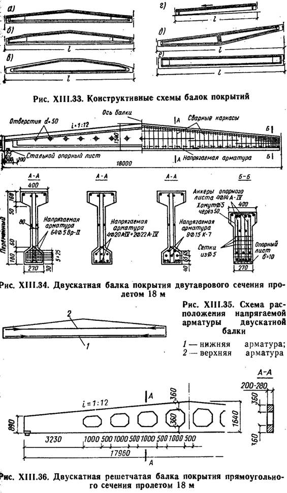 Двускатные балки выполняют из бетона класса В25—В40 и армируют напрягаемой проволочной, стержневой и канатной арматурой (рис. XIII.34). При армировании высокопрочной проволокой ее располагают группами по 2 шт. в вертикальном положении, что создает удобства для бетонирования балок в вертикальном положении. Стенку балки армируют сварными каркасами, продольные стержни которых являются монтажными, а поперечные — расчетными, обеспечивающими прочность балки по наклонным сечениям; приопорные участки балок для предотвращения образования продольных трещин при отпуске натяжения арматуры (или ограничения ширины их раскрытия) усиливают дополнительными поперечными стержнями, которые приваривают к стальным закладным деталям. Повысить трещиностойкость приопорного участка балки можно созданием двухосного предварительного напряжения (натяжением также и поперечных стержней). Двускатные балки двутаврового сечения для ограничения ширины раскрытия трещин, возникающих в верхней зоне при отпуске натяжения арматуры, целесообразно армировать также и конструктивной напрягаемой арматурой, размещаемой в уровне верха сечения на опоре (рис. XIII.35). Этим уменьшаются эксцентриситет силы обжатия и предварительные растягивающие напряжения в бетоне верхней зоны. Двускатные балки прямоугольного сечения с часто расположенными отверстиями условно называют решетчатыми балками (рис. XIII.36). Типовые решетчатые балки в зависимости от значения расчетной нагрузки имеют градацию ширины прямоугольного сечения 200, 240 и 280 мм. Для крепления плит покрытий в верхнем поясе балок всех типов заложены стальные детали. Балки покрытия рассчитывают как свободно лежащие нагрузки от плит передаются через ребра. При пяти и больше сосредоточенных силах нагрузку заменяют эквивалентной равномерно распределенной. Для двускатной балки расчетным оказывается сечение, расположенное на некотором расстоянии х от опоры. Так, при уклоне верхнего пояса 1: 12 и высоте балки в середине пролета h=l/12 высота сечения на опоре составит hоп=l/ 24, а на расстоянии х от опоры