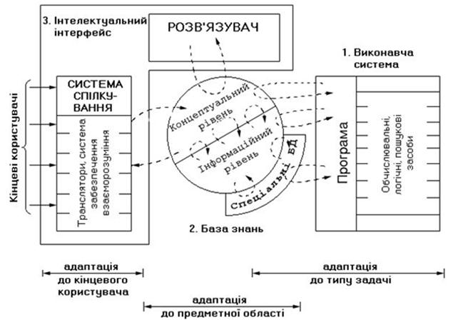 Рис. 5 Ця структура складається з трьох комплексів обчислювальних засобів (див. малюнок). Перший комплекс є сукупністю засобів, що виконують програми (виконавчу систему), спроектованих з позицій ефективного розв’язання завдань, має у ряді випадків проблемну орієнтацію. Другий комплекс - сукупність засобів інтелектуального інтерфейсу, що мають гнучку структуру, яка забезпечує можливість адаптації в широкому спектрі інтересів кінцевих користувачів. Третім комплексом засобів, за допомогою яких організовується взаємодія перших двох, є база знань, що забезпечує використання обчислювальними засобами перших двох комплексів цілісної і незалежної від оброблюючих програм системи знань про проблемне середовище. Виконавча система (ВС) об’єднує всю сукупність засобів, що забезпечують виконання сформованої програми. Інтелектуальний інтерфейс - система програмних та апаратних засобів, що забезпечують для кінцевого користувача використання комп’ютера для розв’язання завдань, які виникають в сфері його професійної діяльності або без посередників, або з незначною їх допомогою. База знань (БЗ) – займає центральне положення по відношенню до решти компонентів обчислювальної системи в цілому, через БЗ здійснюється інтеграція засобів ОС, завдань, що беруть участь у розв’язанні. 7. Класифікація ІІС Ознаки класифікації ІІС Інтелектуальна інформаційна система заснована на концепції використання бази знань для генерації алгоритмів розв’язання прикладних завдань різних класів залежно від конкретних інформаційних потреб користувачів. Для ІІС характерні наступні ознаки: · розвинуті комунікативні здібності; · уміння розв’язувати складні погано формалізовані задачі; · здатність до самостійного навчання; · адаптивність. Кожній з перерахованих ознак умовно відповідає свій клас ШІС. Різні системи можуть володіти однією або декількома ознаками інтелектуальності з різною мірою проявлення. Засоби ШІ можуть використовуватися для реалізації різних функцій, що виконуються ШІС. На рис. 5 наведена класифікація ШІС, ознаками якої є наступні інтелектуальні функції: · комунікативні здібності – спосіб взаємодії кінцевого користувача з системою; · розв’язання складних погано формалізованих задач, які потребують побудови оригінального алгоритму розв’язання залежно від конкретної ситуації, що характеризується невизначеністю та динамічністю початкових даних та знань; · здатність до самостійного навчання – уміння системи автоматично вилучати знання з накопиченого досвіду та застосовувати їх для розв’язання задач; · адаптивність – здатність системи розвиватися відповідно до об’єктивних змін області знань.