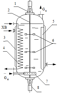 Верхнее расположение привода более удобно для обслуживания, нижнее обеспечивает более высокий уровень стерильности. Число ярусов мешалки - от 1 до 6 и зависит от высоты и геометрических пропорций аппарата. Число оборотов мешалки зависит от типа мешалки и обычно не превышает 300 об/мин. Число отражательных перегородок обычно 3-8 и зависит от диаметра аппарата, а их ширина составляет 0,1-0,12 D аппарата. Внутренние теплообменники - обычно трубчатые, самых разных конструкций, а внешние - рубашки разных конструкций. Рис. 6. Ферментер с перемешиванием и барботажем: 1 - привод; 2 - вал; 3 - рубашка; 4 - змеевик; 5 - отражательная перегородка; 6 - мешалка; 7 - барботер; 8 - нижний привод. Достоинства - высокая интенсивность массообменного процесса, возможность регулирования параметров (nс, Qг), стерильность процесса, отработанность конструкции. Недостатки - относительно высокая энергоемкость, сложность мойки и стерилизации из-за множества внутренних устройств.