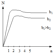 (рис.10). Условие максимальной мощности соответствует так называемому полному отражению, т.е. полному подавлению вращательного движения жидкости. Условие полного отражения записывается: (b·n/D)³0,5, где n - число перегородок; b - ширина перегородок; D - диаметр аппарата. В условиях полного отражения наибольшая часть энергии затрачивается на создание турбулентных пульсаций, что интенсифицирует процесс массопередачи, т.е. увеличение затрачиваемой мощности положительно влияет на процесс ферментации и экспериментально установлено, что KLF ~ (NДВ/VЖ)0,7, т.е. массоперенос в степени 0,7 пропорционален подводимой мощности. 14
