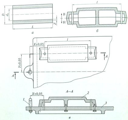 Рисунок 4.44 – Монтаж модели (б) отливки «Гильза» (а) на подмодельной плите (в); 1 – центрирующий штырь, 2 – половина модели, 3 – подмодельная плита
