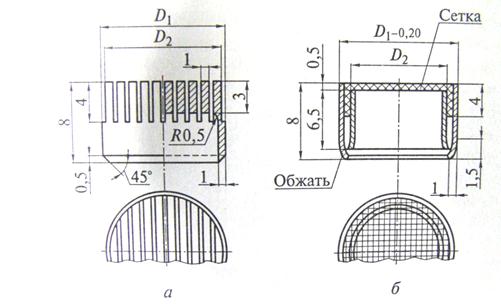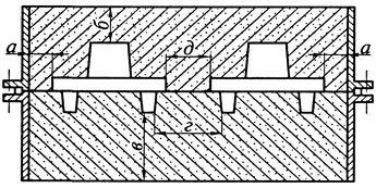 Рисунок 4.48 – Венты: а – литые с прорезями, б – составные с сеткой. В массовом и крупносерийном производстве стержни, изготавливавшиеся до недавних пор в основном в горячих ящиках, которые нагревают в печах, или индивидуальными газовыми горелками, а также встроенными электрическими нагревателями, в настоящее время изготавливают с использованием ХТС, отверждаемых продувкой газовыми реагентами. Процесс отверждения стержневой смеси по «горячим ящикам» происходит при температуре 200…250°С, поэтому ящик должен быть достаточно жестким, противостоять короблению при циклических нагревах. Наиболее подходящим материалом для таких стержневых ящиков является серый чугун. Для ХТС –процессов ящики могут быть деревянными или алюминиевыми, которые содержат бронеплиты, а также металлические вставки. Для предупреждения утечки «газа» при продувке по плоскости разъема стержневого ящика необходимо применять уплотнение. Например, на обеих половинах стержневого ящика делаются канавки: на одной половине шириной 5 мм,на другой 6 мм.В узкие канавки вставляются мягкие упругие уплотнители. В нижней половине ящика между уплотнителем и внутренней стороной канавки делают небольшой зазор. В этот зазор при надуве стержневого ящика и продувке «газа» попадает сжатый воздух и «газ», которые прижимают ленту к внешней стороне канавки и тем самым повышают качество уплотнения. Используются и другие конструкции уплотнений. Упругое уплотнение делается между стержневым ящиком и коллекторами (впускным, выпускным), а также по разъему ящика. Если стержневой ящик имеет вкладыши, расположенные в плоскости разъема, то прокладки должны огибать вкладыши, сохраняя непрерывность. В деревянных стержневых ящиках прокладки следует делать в металлических пластинах, располагаемых по плоскости разъема. Вдув смеси в ящик может производиться через вдувные отверстия пескострельной плиты или при помощи специальных вдувных сопел. Вдувные сопла обычно изготавливаютиз углеродистых сталей, тонкостенных тянутых или механически обработанных стальных труб в зависимости от конструкции используемого упругого уплотнительногонаконечника. Рекомендуют также использовать нейлоновые или литые полиуретановые сопла. Сопла изнейлона хорошо противостоят воздействию на них связующих, используемых при аминовом процессе. Для изготовления простых компактных стержней могут использоваться стержневые ящики, как с горизонтальным, так и с вертикальным разъемом. Для выхода воздуха из ящика может быть использована поверхность разъема, в которой для этого делаются специальные щели. Глубина щелей составляет 0,15…0,20 мм,благодаря чему через них может свободно проходить воздух, а стержневая смесь не проходит. Наиболее простой, эффективный и экономичный способ вентилирования обеспечивается применением вент с отверстиями продолговатого или сетчатого типа. Они легко устанавливаются в стержневом ящике. Во многих случаях конфигурация стержня требует устройства в стержневом ящике отъемных частей. Отъемные части должны точно устанавливаться в стержневом ящике и легко выниматься из ящика при извлечении стержня. Рекомендуется отъемные части крепить вящике при помощи ласточкина хвоста. Крупные отъемные части можно крепить также при помощи штырей. Для предупреждения подъема и смещения о