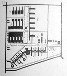Рис.18 Учебно-научный комплекс в Ростове-на-Дону (проект): А- схема генерального плана; 1- университет и НИИ научного центра высшей школы; 2- специальное лабораторное и опытное производство; 3- конструкторское бюро; 4- отраслевые и академические НИИ; 5- научно-учебная зона (резерв); 6- общая коммунально-хозяйственная зона; б- главная площадь факультета естественных наук; 1- НИИ; 2- учебные факультеты; 3- Кооперативные помещения