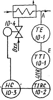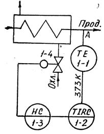 В случае отличии текущей температуры в т.А от заданного значения (задатчик прибора 10 - 2) вырабатывается сигнал рассогласования, усиливается и воздействует на ИМ, перемещая РО. При этом в зависимости от знака сигнала рассогласования увеличивается или уменьшается подача охладителя.