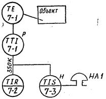 3. 1 – 1 – ТХА – 0515 (термопара хромель-алюмелевая); 1 – 2 – ПТ-ТП – 68 или НП-ТЛ1-М – нормирующий преобразователь – преобразует неунифицированный электрический сигнал в унифицированный электрический токовый сигнал; 1 – 3 – ЭПП-68 – электропневматический преобразователь – преобразует унифицированный электросигнал в унифицированный пневматический сигнал; 1 – 4 – ПВ4.2П – вторичный прибор системы «Старт» - показывающий, регистрирующий.