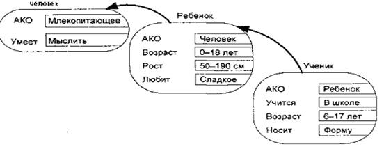 В таблице дополнительные столбцы (3-й и 4-й) предназначены для описания способа получения слотом его значения и возможного присоединения к тому или иному слоту специальных процедур, что допускается в теории фреймов. В качестве значения слота может выступать имя другого фрейма, так образуются сети фреймов. Существует несколько способов получения слотом значений во фрейме-экземпляре: • по умолчанию от фрейма-образца (Default-значение); • через наследование свойств от фрейма, указанного в слоте АКО; • по формуле, указанной в слоте; • через присоединенную процедуру; • явно из диалога с пользователем; • из базы данных. Важнейшим свойством теории фреймов является заимствование из теории семантических сетей – так называемое наследование свойств. И во фреймах, и в семантических сетях наследование происходит по АКО-связям (A-Kind-Of = это). Слот АКО указывает на фрейм более высокого уровня иерархии, откуда неявно наследуются, т. е. переносятся, значения аналогичных слотов. Например, в сети фреймов на следующем рисунке понятие "ученик" наследует свойства фреймов "ребенок" и "человек", которые находятся на более высоком уровне иерархии. На вопрос "любят ли ученики сладкое?" следует ответ "да", т. к. этим свойством обладают все дети, что указано во фрейме "ребенок". Наследование свойств может быть частичным: возраст для учеников не наследуется из фрейма "ребенок", поскольку указан явно в своем собственном фрейме.