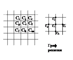 Математические модели монтажного пространства Под монтажной областью типовой конструкции понимается метрическое пространство, в котором устанавливаются входящие в неё типовые конструкции предыдущих уровней, и выполняется электронное соединение выводов. Формальная постановка и решение задач в топологическом конструировании невозможны без получения математической модели монтажного пространства. К которой предъявляются требования высокой степени формализации и наиболее точного и полного отображения метрических параметров и топологических свойств конструкции. Метрическими параметрами являются габаритные размеры зоны монтажа, допустимая ширина проводников и зазоры между ними, координаты и размеры внешних контактных площадок, шаг установки и размер модулей, координаты и размеры полей их контактов. К топологическим свойствам относятся: число слоев МПП и переходов со слоя на слой; наличие замкнутых областей, запрещенных для проведения соединений; ограничение на взаимное расположение соединений; количество монтажных проводов, проводимых к одному выводу цепи. В качестве математической модели монтажного пространства используется неориентированный топологический граф Gr (граф решетки). При этом плоскость монтажного пространства разбивается на элементарные площадки, стороны которых равны шагу проложения проводника по соответствующему направлению. Для печатного монтажа элементарная площадка – квадрат. Каждой элементарной площадке ставится в соответствие вершина графа решетки. Две вершины графа соединяются ребром, если между соответствующими площадками может быть проведено соединение с учетом метрических и топологических параметров конструкции. Пример ортогонального монтажа.