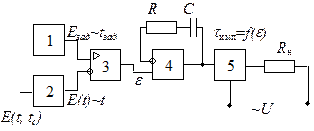Электронные регуляторы – функционально законченные устройства, предназначенные для регулирования температуры. Могут выполнять функции дистанционной передачи показаний и сигнализации. Не предназначены для визуального наблюдения измеренного значения температуры. Электронные регуляторы работают в комплекте с термометрами сопротивления или термопарами. В состав электронного регулятора входят: - реохордный задатчик; - устройство компенсации температуры свободных концов для ТП или мостовая измерительная схема для ТС; - усилитель сигнала отклонения; - реле или бесконтактное выходное устройство; - устройства сигнализации «мало» и «много»; - вспомогательные устройства (источник питания и т.п.). Рассмотрим функциональную схему простейшего ЭР температуры дискретного действия. 1 - 2 - устройство компенсации температуры свободных концов t с; 3 - усилитель отклонения; 4 - импульсный элемент; 5 - реле или/и тиристорный ключ; R н - сопротивление нагревателей печи; R, С - элементы обратной связи импульсного элемента. Регулятор температуры работает следующим образом. С выхода реохордного задатчика 1 снимается малое напряжение постоянного тока Е зад, связанное с заданным значением температуры t зад. Шкала задатчика оцифрована в градусах Цельсия. Для измерения текущего значения температуры t используют термопару (на схеме не показана), которая вырабатывает сигнал Е (t, t c). Этот сигнал поступает на вход устройства 2 компенсации температуры свободных концов t с. С выхода устройства 2 снимается выходной сигнал Е(t), связанный с текущим значением температуры t. Оба сигнала – Е зад и Е(t) – поступают на входы усилителя отклонения 3, где вычисляется сигнал отклонения ε = Е зад– Е(t). Сигнал отклонения ε подается на вход импульсного элемента 4, где преобразуется в соответствии с законом регулирования в последовательность импульсов. R-C элементы обратной связи используют для настройки параметров закона регулирования. Последовательность импульсов с выхода импульсного элемента 4 поступает на реле или/и тиристорный ключ 5, что приводит к изменению мощности в нагрузке R н. Работу дискретного регулятора можно проиллюстрировать следующим образом. Отклонение составляет ε = t зад– t.
