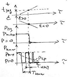 Импульсный закон регулирования: А имп = Р max = const; Т имп = const; τ имп = var. Амплитуда импульсов А имп и период их следования Т имп постоянны, а длительность импульсов τ имп определяется законом регулирования: τ имп= F(ε, P им= P ср= А имп · τ имп/ Т имп = (Р max/ Т имп) · F (…). Таким образом, получаем, что при позиционном законе регулирования длительность импульса мощности на нагревателях печи определяется только знаком отклонения и не зависит от его значения. В этом случае качество регулирования будет невысоким. С проблемами позиционного регулирования можно ознакомиться при выполнении лаб. работы №4. При импульсном законе регулирования длительность импульса мощности на нагревателях зависит от значения отклонения (τ имп= F(ε,