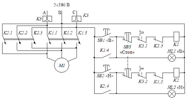 Для движения вперед («В») используют магнитный пускатель K1 и схему управления, аналогичную схеме, рассмотренной ранее. Контакты K1.4 замыкают кнопку SB1; при этом катушка K1 ставится на самопитание. Силовые контакты K1.1 - K1.3 подключают электродвигатель М1 к сети (последовательность фаз, подключаемых к обмоткам электродвигателя – А-В-С).