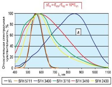 LX1972 — недорогой кремниевый датчик света, эмулирующий человеческий глаз (пик на 520 нм), но с IК-срабатыванием менее чем ±5% и спектральной чувствительностью более 900 нм. Диодный массив датчика обеспечивает токовую передаточную функцию. Выходной фототок датчика может быть использован непосредственно или преобразован в напряжение. Токовые зеркала усиливают фототок до уровня чувствительности, который может быть преобразован в масштабируемое напряжение со стандартным номиналом внешнего резистора. Новейшим дополнением к линейке устройств автомобильного назначения Microsemi является LX1973 (рис.93е–и) — датчик с широким динамическим диапазоном и частично экспоненциальной выходной характеристикой, с технологией отмены темновых токов, оптимизированный для восприятия уровней низкого света. С 8-битным АЦП датчик детектирует уровни освещенности от 0,001 до 500 лк. LX1973 также отличается высоким PSRR в 35 дБ. LX1973 рассчитан на автомобильные применения, такие как автоматический контроль яркости автомобильных дисплеев и фар или контроль контрастности зеркал заднего вида. LX1973 также подходит для многих других применений — например, ноутбуков, LCD-телевизоров и т. п. OSRAM Opto Semiconductors предлагает на автомобильный рынок СALS SFH 5711 (рис. 94а–ж) со спектральной чувствительностью, максимально приближающейся к спектральной характеристике чувствительности человеческого глаза — с адаптацией к окружающему освещению и подавлением IК-лучей (рис. 94е). Логарифмический выход датчика SFH 5711 (рис. 94б–г) обеспечивает работу датчика с высокой точностью в широком динамическом диапазоне. Передаточная функция составляет 10 мкА/дек. Угол уменьшения чувствительности вдвое — ±60°. SFH 5711 отличается низким температурным коэффициентом. Напряжение питания датчика 2,3–5 В. Размеры корпуса составляют 2,8^2,2^1,1 мм с чувствительной областью 0,4^0,4 мм. Основные применения этого датчика — автомобильные, включая контроль дисплеев, приборных панелей, подсветки, фар, дисплеев HUD. В сотовых телефонах устройство может быть использовано для контроля подсветки дисплеев и клавиатур.