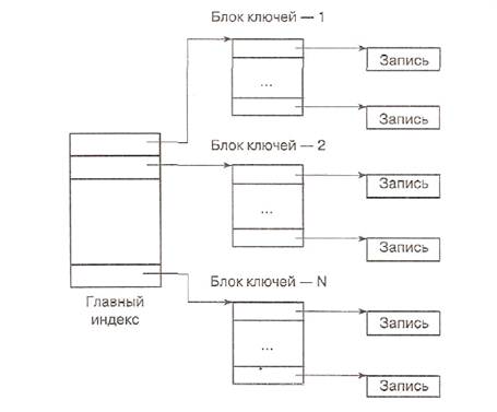 Рис. 3.4. Двухуровневая схема индексации В этой схеме индекс основной таблицы распределен по совокупности файлов: одному файлу главного индекса и множеству файлов с блоками ключей. На практике для создания индекса для некоторой таблицы БД пользователь указывает поле таблицы, которое требует индексации. Ключевые поля таблицы во многих СУБД как правило индексируются автоматически. Индексные файлы, создаваемые по ключевым полям таблицы, часто называются файлами первичных индексов. Индексы, создаваемые пользователем для не ключевых полей, иногда называют вторичными (пользовательскими) индексами. Введение таких индексов не изменяет физического расположения записей таблицы, но влияет на последовательность просмотра записей. Индексные файлы, создаваемые для поддержания вторичных индексов таблицы, обычно называются файлами вторичных индексов. Связь вторичного индекса с элементами данных базы может быть установлена различными способами. Один из них — использование вторичного индекса как входа для получения первичного ключа, по которому затем с использованием первичного индекса производится поиск необходимых записей (рис. 3.5).
