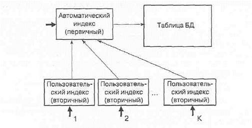 Рис. 3.5. Способ использования вторичных индексов Некоторыми СУБД, например Access, деление индексов на первичные и вторичные не производится. В этом случае используются автоматически создаваемые индексы и индексы, определяемые пользователем по любому из не ключевых полей. Главная причина повышения скорости выполнения различных операций в индексированных таблицах состоит в том, что основная часть работы производится с небольшими индексными файлами, а не с самими таблицами. Наибольший эффект повышения производительности работы с индексированными таблицами достигается для значительных по объему таблиц. Индексирование требует небольшого дополнительного места на диске и незначительных затрат процессора на изменение индексов в процессе работы. Индексы в общем случае могут изменяться перед выполнением запросов к БД, после выполнения запросов к БД, по специальным командам пользователя или программным вызовам приложений.