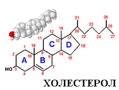 Ингибиторы синтеза эйкозаноидов. Кортикостероиды ингибируют фосфолипазу А2, тем самым они ингибируют высвобождение арахидоновой кислоты из состава мембранных фосфолипидов. Ингибиторы из числа противовоспалительных препаратов нестероидной природы (аспирин, индометацин, фенилбутазон) ингибируют циклоксигеназу. Простагландины стимулируют сокращение гладких мышц, липолиз, снижают секрецию желудочного сока, свертывание крови, вызывают расширение кровеносных сосудов. Тромбоксаны стимулируют агрегацию тромбоцитов, сокращение стенки артерий, образование цАМФ в тромбоцитах, повышают кровяное давление. Лейкотриены участвуют в формировании воспаления, аллергических реакций, в хемотаксисе. Тема 14. СИНТЕЗ И НАРУШЕНИЯ ОБМЕНА ХОЛЕСТЕРОЛА, Значение холестерола для организма. Холестерол (ХС) является важным составным компонентом биомембран, он служит предшественником для синтеза стероидных гормонов, желчных кислот и витамина Д. Распределение холестерола в тканях. Наиболее богаты холестеролом мозг, печень, кожа и эндокринные железы. Смесь свободного и эстерифицированного холестерола. И холестерол пищи, и холестерол в системе кровообращения являются смесью приблизительно 70 % эфиров холестерола (ЭХ) и 30 % свободного холестерола (СХ). Это соотношение остается постоянным в различных условиях (рис. 14.1). Чаще других в эстерификации холестерола участвуют олеиновая (18:1, D 9) и линолевая (18:2, D 9, 12) кислоты.