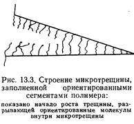 В этом случае в вершине возникшей трещины находятся ориентированные сегменты полимера. Трещина, в основном заполненная ориентированными сегментами полимера, в результате вынужденно-эластической деформации в микрообъеме полимера называется микротрещиной. Это не означает, что мы имеет дело просто с маленькой трещиной. Если микротрещина не разрослась и не превратилась в трещину, в отличие от последней при нагревании она может релаксировать. Когда вынужденно-эластическая деформация сегментов исчезнет, микротрещина «залечивается». Трещина же при нагревании не залечивается и при повторной деформации начинает расти вновь. Ориентированный полимер, заполняющий микротрещину, имеет гораздо больший показатель преломления, чем окружающий полимер; он сильно рассеивает свет и в том месте, где образовалось много микротрещин, возникает блеск, похожий на металлический. Мы видим, что при разрушении даже хрупкого полимера, где перемещение сегментов под действием перенапряжений в вершине растущей трещины относительно невелико и внешне вынужденно-эластическая деформация не проявляется, наибольшие затраты энергии при разрушении идут на деформацию и связанное с этим рассеяние механической энергии в виде теплоты. Особенно сильно поглощается механическая энергия при образовании микротрещин. Чем больше образуется микротрещин (например, при ударе), тем труднее разрушить полимер, тем выше его стойкость к ударным нагрузкам. Образование микротрещин часто проявляется в виде побеления («серебрения») образца в месте удара. Полимеры в высокоэластическом состоянии к моменту разрушения достигают значительной деформации. Это оказывает сильное влияние на механизм разрыва. На рис. 13.4 показано схематически, как в эластомере первоначальная трещина с острой вершиной затем при деформации постепенно расширяется (раскрывается), но не растет.
