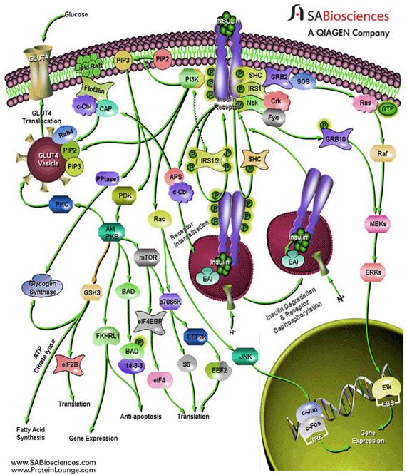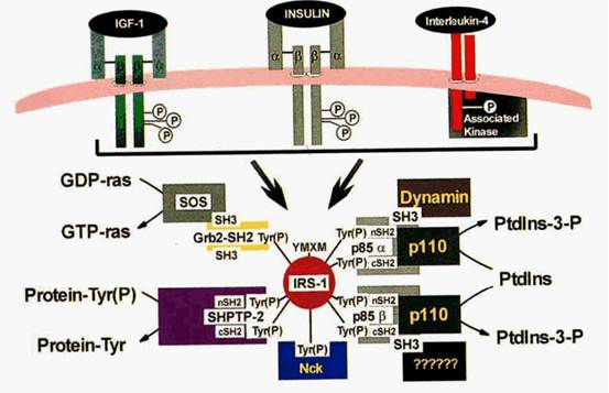 Мутации, сопровождающиеся снижением рецепторной активности тирозинкиназы; Мутации, приводящие к дефектам связывания инсулина; Мутации, ухудшающие внутриклеточный транспорт и посттрансляционный процессинг; Мутации, приводящие к снижению скорости биосинтеза рецептора; Мутации в гене рецептора инсулина, которые приводят к ингибированию тирозинкиназы, сочетаются с резко выраженной инсулиновой резистентностью. Аутофосфорилирование трех остатков тирозина (Tyr1146, Tyr1150, Tyr1151) усиливает активность киназ в 10-20 раз. Мутация одного или всех трех остатков тирозина приводит к резкому снижению инсулин-стимулируемой активности киназ. Мутации в гене рецептора инсулина Сигнальные пути инсулина Передача инсулинового сигнала через белки-субстраты инсулинового рецептора. ИНСУЛИНОВАЯ СИСТЕМА
