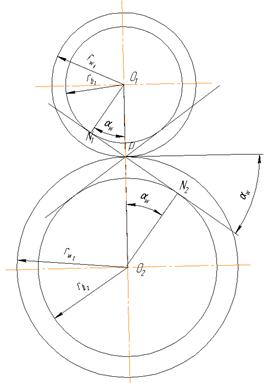 К числу свойств эвольвентного зацепления относится и свойство беззазорного зацепления (отсутствие бокового зазора). Особенно это важно при реверсивном движении. Из условия беззазорного зацепления и перекатывания начальных окружностей без скольжения можно записать