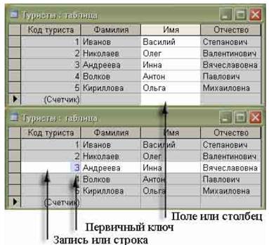 Рис. 1. Названия объектов в таблице Для работы с данными используются системы управления базами данных (СУБД). Основные функции СУБД: · определение данных (описание структуры баз данных); · обработка данных; · управление данными. Разработка структуры БД – важнейшая задача, решаемая при проектировании БД. Структура БД (набор, форма и связи ее таблиц) – это одно из основных проектных решений при создании приложений с использованием БД. Созданная разработчиком структура БД описывается на языке определения данных СУБД. Любая СУБД позволяет выполнять следующие операции с данными: – добавление записей в таблицы; – удаление записей из таблицы; – обновление значений некоторых полей в одной или нескольких записях в таблицах БД; – поиск одной или нескольких записей, удовлетворяющих заданному условию. Для выполнения этих операций применяется механизм запросов. Результатом выполнения запросов является либо отобранное по определенным критериям множество записей, либо изменения в таблицах. Запросы к базе формируются на специально созданном для этого языке, который так и называется «язык структурированных запросов» (SQL – Structured Query Language). Под управлением данными обычно понимают защиту данных от несанкционированного доступа, поддержку многопользовательского режима работы с данными и обеспечение целостности и согласованности данных.