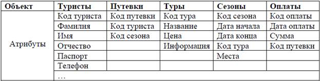 Далее модель развивается путем определения атрибутов для каждого объекта. Атрибуты объекта – это элементы данных, относящиеся к определенному объекту, которые должны сохраняться. Анализируем составленный словарь данных, выделяем в нем объекты и их атрибуты, расширяем словарь при необходимости. Следует обратить внимание, что несколько элементов отсутствуют. Опущена регистрационная информация, упомянутая в функциональной спецификации. Как ее учесть, вы подумаете самостоятельно и доработаете предложенный пример. Но более важно то, что пока отсутствуют атрибуты, необходимые для связи объектов друг с другом. Эти элементы данных в ER-модели не представляются, так как не являются, собственно, «натуральными» атрибутами объектов. Они обрабатываются по-другому и будут учтены в реляционной модели данных. Реляционная модель характеризуется использованием ключей и отношений. Существует отличие в контексте реляционной базы данных терминов relation (отношение) и relationship (схема данных). Отношение рассматривается как неупорядоченная, двумерная таблица с несвязанными строками. Схема данных формируется между отношениями (таблицами) через общие атрибуты, которые являются ключами. Существует несколько типов ключей, и они иногда отличаются только с точки зрения их взаимосвязи с другими атрибутами и отношениями. Первичный ключ уникально идентифицирует строку в отношении (таблице), и каждое отношение может иметь только один первичный ключ, даже если больше чем один атрибут является уникальным. В некоторых случаях требуется более одного атрибута для идентификации строк в отношении. Совокупность этих атрибутов называется составным ключом. В других случаях первичный ключ должен быть специально создан (сгенерирован). Например, в отношение «Туристы» имеет смысл добавить уникальный идентификатор туриста (код туриста) в виде первичного ключа этого отношения для организации связей с другими отношениями БД. Другой тип ключа, называемый внешним ключом, существует только в терминах схемы данных между двумя отношениями. Внешний ключ в отношении – это атрибут, который является первичным ключом (или частью первичного ключа) в другом отношении. Это – распределенный атрибут, который формирует схему данных между двумя отношениями в БД. Для проектируемой БД расширим атрибуты объектов кодовыми полями в качестве первичных ключей и используем эти коды в отношениях БД для ссылки на объекты БД следующим образом (табл. 2). Построенную схему БД еще рано считать законченной, так как требуется ее нормализация. Процесс, известный как нормализация реляционной БД, используется для группировки атрибутов специальными способами, чтобы минимизировать избыточность и функциональную зависимость. Таблица 2 Объекты и атрибуты БД с расширенными кодовыми полями