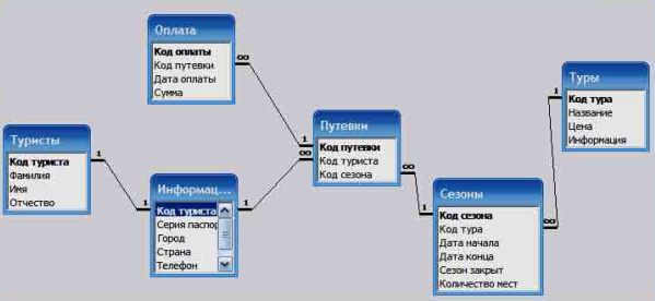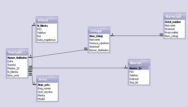 Рис. 4. Схема данных базы BDTur Описание структуры базы данных «Автосервис» Услуги в автосервисе выполняются мастером - универсалом и любой мастер может выполнить любую услугу, которая осуществляется в нашем автосервисе. Клиент, приехавший в автосервис, выбирает нужную ему услугу, из имеющегося у нас в автосервисе перечня. Мастер выписывает клиенту накладную. На каждую услугу выписывается отдельная накладная.