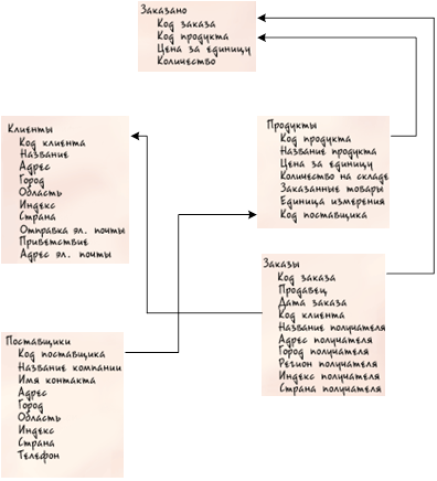 Существует три типа межтабличных связейОколо полей «Код туриста» обеих таблиц на связи расположено изображение единицы, указывающее на принадлежность связи к отношению «один-к-одному». Это означает, что одной записи в таблице «Туристы» будет соответствовать одна запись в таблице «Информация о туристах». Существуют также другие типы отношений – «один-ко-многим» и «многие-ко-многим». Отношение «один-ко-многим» далее появится у нас между таблицами «Информация о туристах» и «Путевки» – один турист может приобрести несколько путевок, что и находит логическое отражение в связи между таблицами. Другой возможный тип – «многие-ко-многим» в нашей базе данных отсутствует, но его примером может служить связь между таблицами с преподавателями и предметами: один преподаватель может вести несколько предметов, но и один предмет могут вести несколько преподавателей. Продолжая определение связей между таблицами, получим следующую схему базы данных (рис. 4). Отношение «один-ко-многим» Рассмотрим базу данных, в которой учитываются заказы, включающую таблицы «Клиенты» и «Заказы». Клиент может разместить любое количество заказов. Следовательно, у любого клиента, представленного в таблице «Клиенты», может быть много заказов, представленных в таблице «Заказы». Поэтому связь между таблицами «Клиенты» и «Заказы» — это отношение «один-ко-многим». Чтобы создать отношение «один-ко многим» в структуре базы данных, добавьте первичный ключ на стороне «один» в таблицу на стороне «многие» в виде дополнительного поля. В данном примере необходимо добавить новое поле — поле «Код» из таблицы «Клиенты» — в таблицу «Заказы» и назвать его «Код клиента». После этого СУБД сможет использовать номер «Код клиента» из таблицы «Заказы» для поиска клиента каждого заказа. Отношение «многие-ко-многим» Рассмотрим связь между таблицей «Продукты» и таблицей «Заказы». Один заказ может включать несколько продуктов. С другой стороны, отдельный продукт может содержаться в нескольких заказах. Следовательно, для каждой записи таблицы «Заказы» может существовать несколько записей в таблице «Продукты» и наоборот. Такой тип связи называется отношением «многие-ко-многим», поскольку для каждого продукта может быть много заказов и наоборот. Обратите внимание, что для обнаружения существующего отношения между таблицами важно рассмотреть обе его стороны. Чтобы представить отношение «многие-ко-многим», нужно создать третью (связующую) таблицу, в которой отношение «многие-ко-многим» разбивается на два отношения «один-ко-многим». Первичные ключи двух таблиц вставляются в третью таблицу. В результате в третьей таблице сохраняются все экземпляры отношения. Например, таблицы «Заказы» и «Продукты» имеют отношение «многие-ко-многим», определяемое созданием двух отношений «один-ко-многим» в таблице «Заказано». В одном заказе может быть много продуктов, и каждый продукт может появляться во многих заказах. Отношение «один-к-одному» При отношении «один-к-одному» каждая запись в первой таблице может иметь не более одной связанной записи во второй таблице и наоборот. Отношения этого типа используются нечасто, поскольку обычно сведения, связанные таким образом, хранятся в одной таблице. Отношение «один-к-одному» используется для разделения таблицы, содержащей много полей, с ц