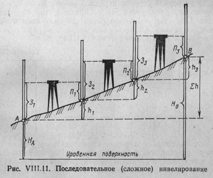Геометрическое нивелирование используется: а). для передачи высот с реперов государственной высотной сети на точки, абсолютные высоты которых необходимо определить (высотная привязка); б). для построения продольных и поперечных профилей; в). для создания сети высотных точек для построения плана крупного масштаба с горизонталями; г). для определения высот ряда точек (высотных опознавательных знаков) на аэрофотоснимках (высотная привязка аэрофотоснимков). При передаче высот от репера А на удаленную точку В прибегают к последовательному нивелированию, которое заключается в нивелировании коротких звеньев и определении превышений между связующими пикетами 1,2,3 и т.д. В результате последовательного нивелирования на местности прокладывается нивелирный ход, состоящий из ряда станций и пикетов. Нивелирные ходы могут быть замкнутыми и разомкнутыми. Разновидностью замкнутого нивелирного хода является такой ход, при котором нивелирование начинается от исходного репера, доходит до конечной определяемой точки и направляется в обратном направлении к исходному реперу по той же линии нивелирования. В этом случае превышения между точками прямого хода должны быть равными превышениям между теми же точками обратного, но иметь противоположные знаки.