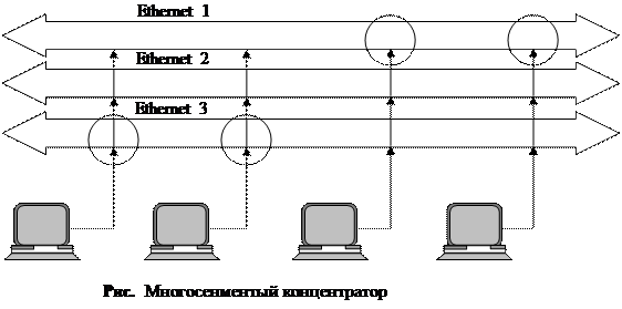 При рассмотрении некоторых моделей концентраторов возникает вопрос — зачем в этой модели имеется такое большое количество портов, например 192 или 240? Имеет ли смысл разделять среду в 10 или 16 Мбит/с между таким большим количеством станций? Возможно, десять — пятнадцать лет назад ответ в некоторых случаях мог бы быть и положительным, например, для тех сетей, в которых компьютеры пользовались сетью только для отправки небольших почтовых сообщений или для переписывания небольшого текстового файла. Сегодня таких сетей осталось крайне мало, и даже 5 компьютеров могут полностью загрузить сегмент Ethernet или Token Ring, а в некоторых случаях — и сегмент Fast Ethernet. Для чего же тогда нужен концентратор с большим количеством портов, если ими практически нельзя воспользоваться из-за ограничений по пропускной способности, приходящейся на одну станцию? Ответ состоит в том, что в таких концентраторах имеется несколько несвязанных внутренних шин, которые предназначены для создания нескольких разделяемых сред. Например, концентратор, изображенный на рис., имеет три внутренние шины Ethernet. Если, например, в таком концентраторе 72 порта, то каждый из этих портов может быть связан с любой из трех внутренних шин. На рисунке первые два компьютера связаны с шиной Ethernet 3, а третий и четвертый компьютеры — с шиной Ethernet 1. Первые два компьютера образуют один разделяемый сегмент, а третий и четвертый — другой разделяемый сегмент.