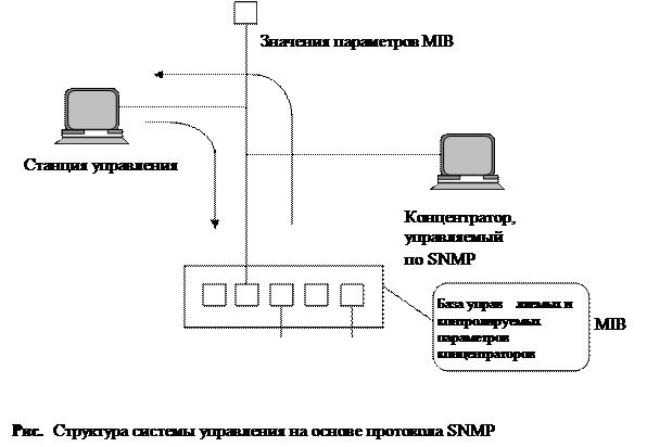 Как видно из описания дополнительных функций, многие из них требуют конфигурирования концентратора. Это конфигурирование может производиться локально, Через интерфейс RS-232C, который имеется у любого концентратора, имеющего блок управления. Кроме конфигурирования в большой сети очень полезна функция наблюдения за состоянием концентратора: работоспособен ли он, в каком состоянии находятся его порты. При большом количестве концентраторов и других коммуникационных устройств в сети постоянное наблюдение за состоянием многочисленных портов и изменением их параметров становится очень обременительным занятием, если оно должно выполняться с помощью локального подключения терминала. Поэтому большинство концентраторов, поддерживающих интеллектуальные дополнительные функции, могут управляться централизованно по сети с помощью популярного протокола управления SNMP (Simple Network Management Protocol) из стека TCP/IP.