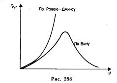 средняя энергия каждой колебательной степени свободы <e>=1/2(kT). Как показал опыт, выражение (15.3) согласуется с экспериментальными данными только в области достаточно малых частот и больших температур. В области больших частот формула Рэлея — Джинса резко расходится с экспериментом, а также с законом Вина (рис. 288). Кроме того, оказалось, что попытка получить закон Стефана — Больцмана (см 15.1) из формулы Рэлея — Джинса приводит к абсурду. Действительно, вычисленная с использованием 15.3 энергетическая светимость черного тела (см. 14.3)
