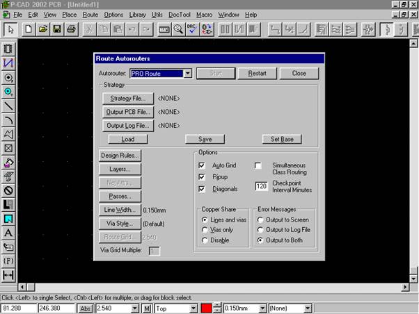 Вызов автотрассировщика производится по команде Options/Route и в появляющемся диалоговом окне в области Autorouter выбрать ProRoute. Данный автотрассировщик имеет большие возможности по сравнению с Quick Route и в этой связи имеет некоторые особенности настройки. В слое Board должна быть указана область трассировки в виде контура, а в случае необходимости барьеры для трассировки. Диалоговое окно данного трассировщика представлено на рисунке 1.