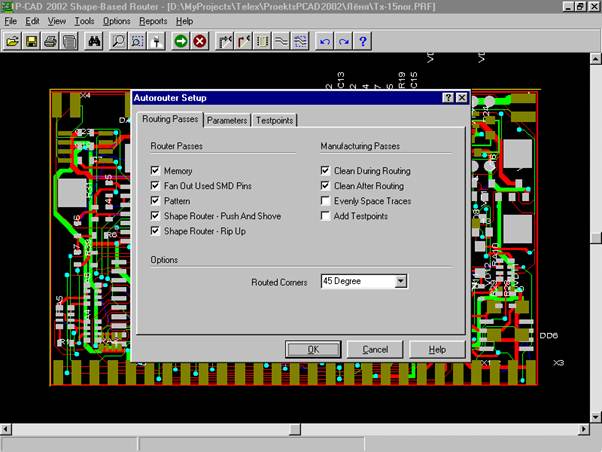 В закладке Router Passes в областях Router Passes и Manufacturing Passes устанавливаются различные процедуры (проходы) трассировки: -Memory - трассирует модули типа «память» в одном, горизонтальном или вертикальном, направлении. Используется эвристические (Heuristic) или регулярные методы поиска (Search). Эту процедуру рекомендуется включать всегда, даже в том случае, если даже нет схем памяти. -Fan out used SMD pins (beep) - эта процедура позволяет генерировать веерообразное расположение стрингеров контактных площадок компонентов. Неудачные места расположения стрингеров помещаются на экране небольшой окружностью жёлтого цвета с символов Х в центре окружности. Процедура используется при наличии планарных выводов компонентов на верхнем, нижнем или обеих сторонах печатной платы. Рекомендуется провести данную процедуру для предварительной трассировки, и если примерно 10% стрингеров не будут сформированы, то компоненты необходимо переразместить. -Pattern - использование стандартных шаблонов (алгоритмов) трассировки, имеющихся в программе. Рекомендуется данный проход включать всегда. -Share Router - Push and Shove - является основным алгоритмом трассировки. При вставке проводников соседние проводники раздвигаются по диагонали без ограничения расстояния при раздвижке проводников. Возможно «перескакивание» проводников через переходные отверстия и контактные площадки. -Share Router - Rip Up - после выполнения процедуры Push and Shove еще возможны некоторые конфликты между проведёнными цепями, которые помечаются жёлтыми кружками. Данная процедура принудительно разрывает уже проложенные цепи и прокладывает их заново с целью ликвидации таких конфликтов. -Clean During Routing - спрямление проводников в процессе трассировки. -Clean After Routing - спрямление проводников после окончания трассировки. -Evenly Space Traces - раздвижка проводников с целью более равномерного заполнения ими всей площади печатной платы. -Add Testpoints - разрешение на вставку контрольных точек электрических цепей согласно установкам, сделанным во вставке Testpoints. В окне Routed Corners закладки Routing Passes устанавливается допустимое значение угла изломов проводников - 45 или 90 градусов. В закладке Parameters устанавливаются параметры трассировки для различных слоев печатной платы (рис.2).