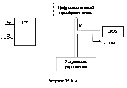 Устройство управления осуществляет последовательный перебор ступеней компенсирующего напряжения сначала старшего разряда, а затем младшего. При этом, если вводимая ступень приводит к тому, что Uк становится больше Ux, т.е. Ux-Uк <0, то срабатывает сравнивающее устройство, которое воздействует на устройство управления, и данная ступень в следующем такте выключается. Если же Ux-Uк >0, то сигнал на выходе сравнивающего устройства не появится и вводимая ступень остается.