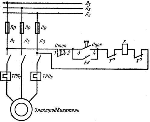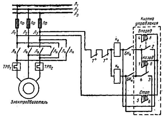 Главные (линейные) контакты Л включаются в рассечку проводов, питающих двигатель. В проводах двух фаз включаются также нагревательные элементы тепловых реле ТРП1 и ТРП2. Катушка электромагнита К подключается к сети через размыкающие контакты тепловых реле Т° и кнопки управления. При нажатии кнопки Пуск напряжение на катушку подается через замкнутые контакты 1—2 кнопки Стоп и замкнутые контакты тепловых реле Т°. После притяженияякоря электромагнита замыкается блок-контакт БК, шунтирующий контакты 3—4 кнопки Пуск. Это дает возможность отпустить пусковую кнопку. Для отключения пускателя нажимается кнопка Стоп. При перегрузке двигателя срабатывают тепловые реле, которые разрывают цепь катушки К. Якорь электромагнита отпадает. Происходит отключение пускателя. Схема включения реверсивного пускателя приведена на рис16.