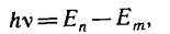 равной разности энергий соответствующих стационарных состояний (Еn и Еm— соответственно энергии стационарных состояний атома до и после излучения (поглощения). При Еm<Еn происходит излучение фотона (переход атома из состояния с большей энергией в состояние с меньшей энергией, т. е. переход электрона с более удаленной от ядра орбиты на более близлежащую), при Еn<Еm — его поглощение (переход атома в состояние с большей энергией, т. е. переход электрона на более удаленную от ядра орбиту). Набор возможных дискретных частот n == (En — Em)/h квантовых переходов и определяет линейчатый спектр атома.