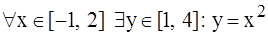 Примеры. 1. Утверждение «Для любого х, взятого из отрезка [-1, 2], можно найти y на отрезке [1, 4], такое, что y = x2» записывается так