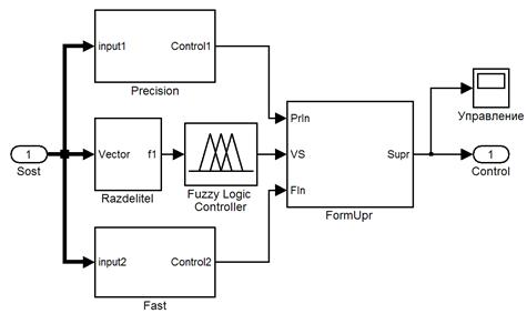 Структурная схема регулятора в среде Matlab состоит из пяти блоков: «Precision» - блок формирования точного закона слежения, «Fast» - формирователь быстродействующего закона, «Razdelitel» - блок, выделяющий из вектора входных переменных, необходимые для получения функции